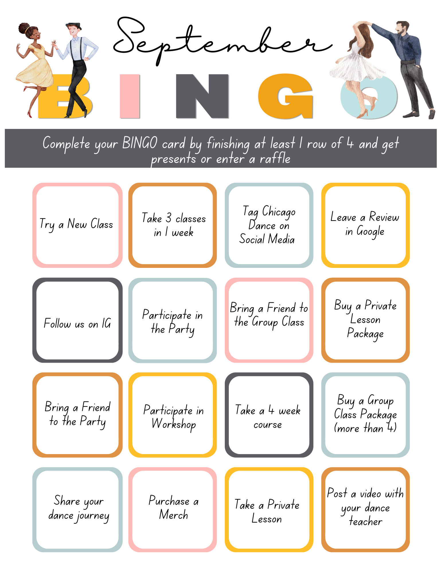 Complete tasks on the bingo card to win fun prizes, stay motivated, and get involved with our dance community!